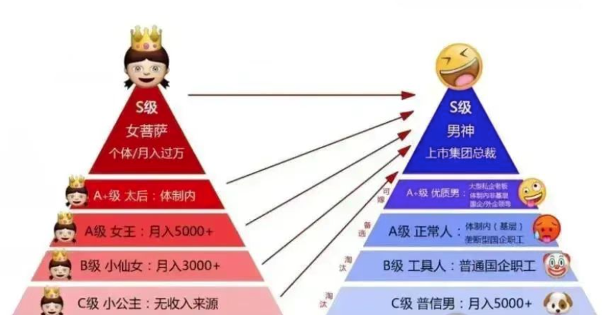 你看到,无论是 S 级的女菩萨,A+的太后,A 级的女王,B 级的小仙女还是 C 级的小公举,所有的目标都指向什么?都指向 S 男,男神,霸道总裁这个级别。